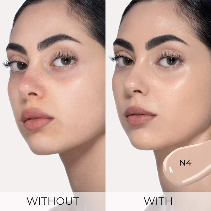 Una base de maquillaje en suero radiante, autofijante, HÍBRIDA, de intensidad media que hidrata y equilibra los aceites para un acabado sin arrugas durante hasta 18 horas.