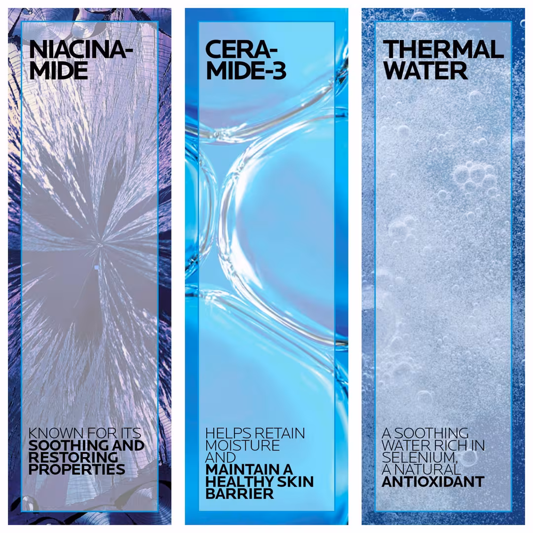 - Ofrece beneficios prebióticos para ayudar a equilibrar el microbioma de la piel con una alta concentración de agua termal de La Roche-Posay.